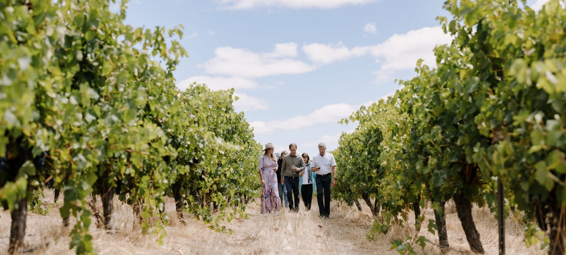 A group of people walking throw lush vineyards with McLeod Tours, Margaret River, Western Australia © Tourism Australia
