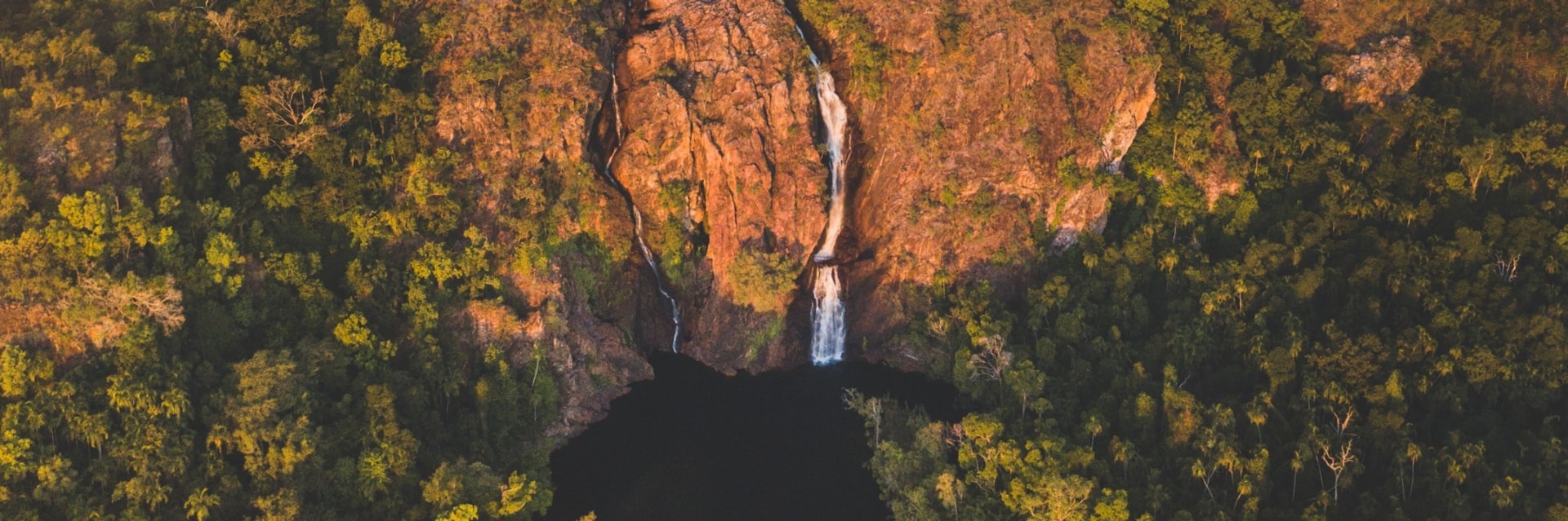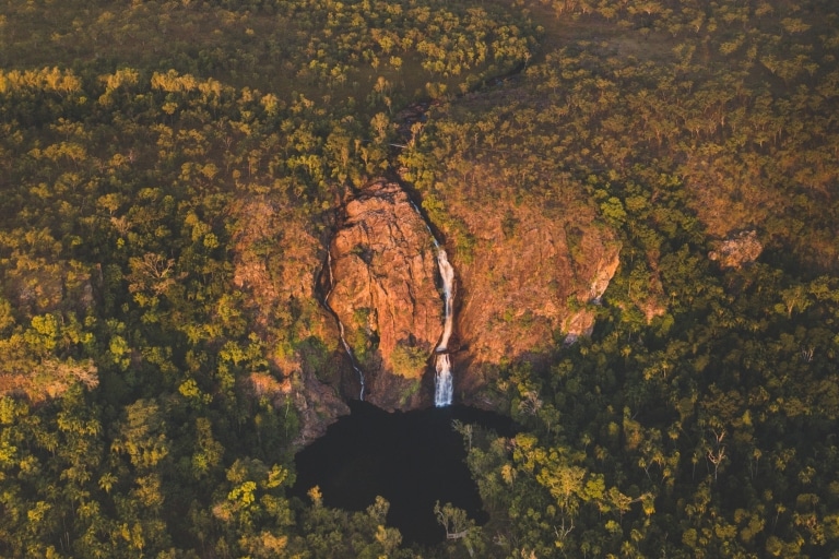 해질녘 노던테리토리의 리치필드 국립공원 내 왕기 폭포와 주변 숲이 석양빛으로 물든 풍경을 공중에서 내려다본 모습 © 노던테리토리 관광청/잭슨 그로브즈(Jackson Groves)