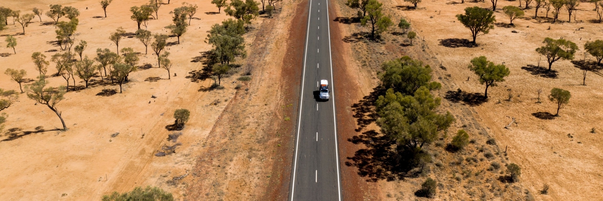 Aerial of a car driving along the Stuart Highway in the Alice Springs Region © Tourism NT, Sam Earp