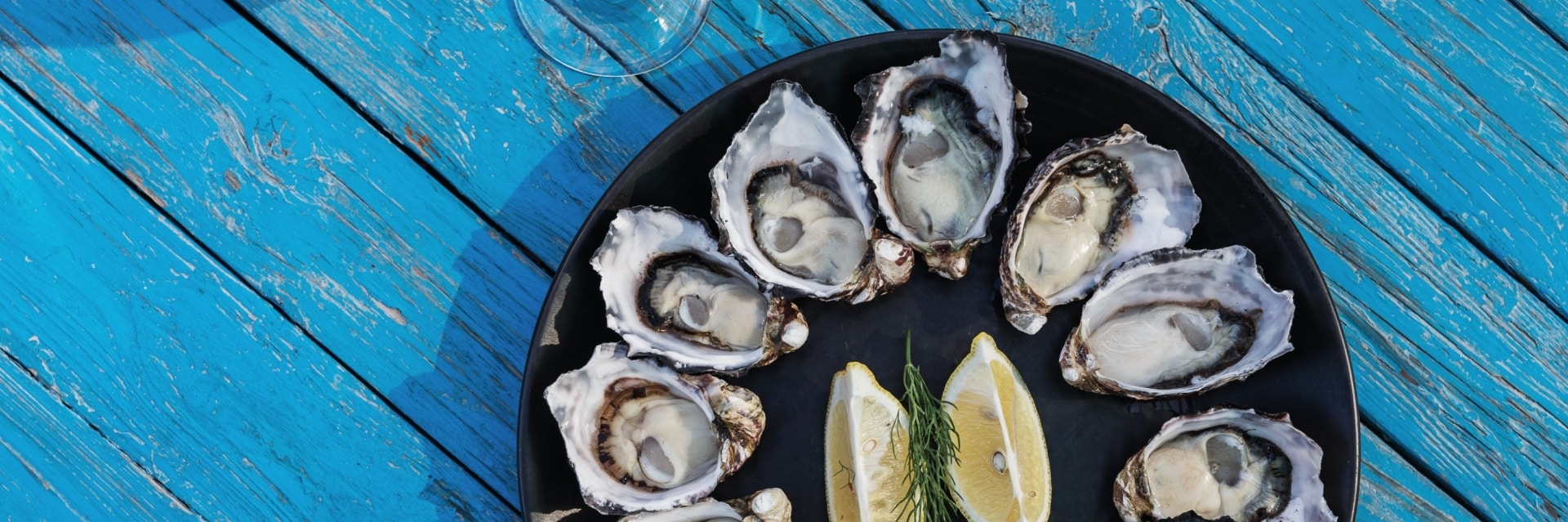 Aerial view over a plate of oysters spread out in a circle with lemon wedges in the centre on a blue table with Get Shucked, Bruny Island, Tasmania © Adam Gibson/Tourism Tasmania